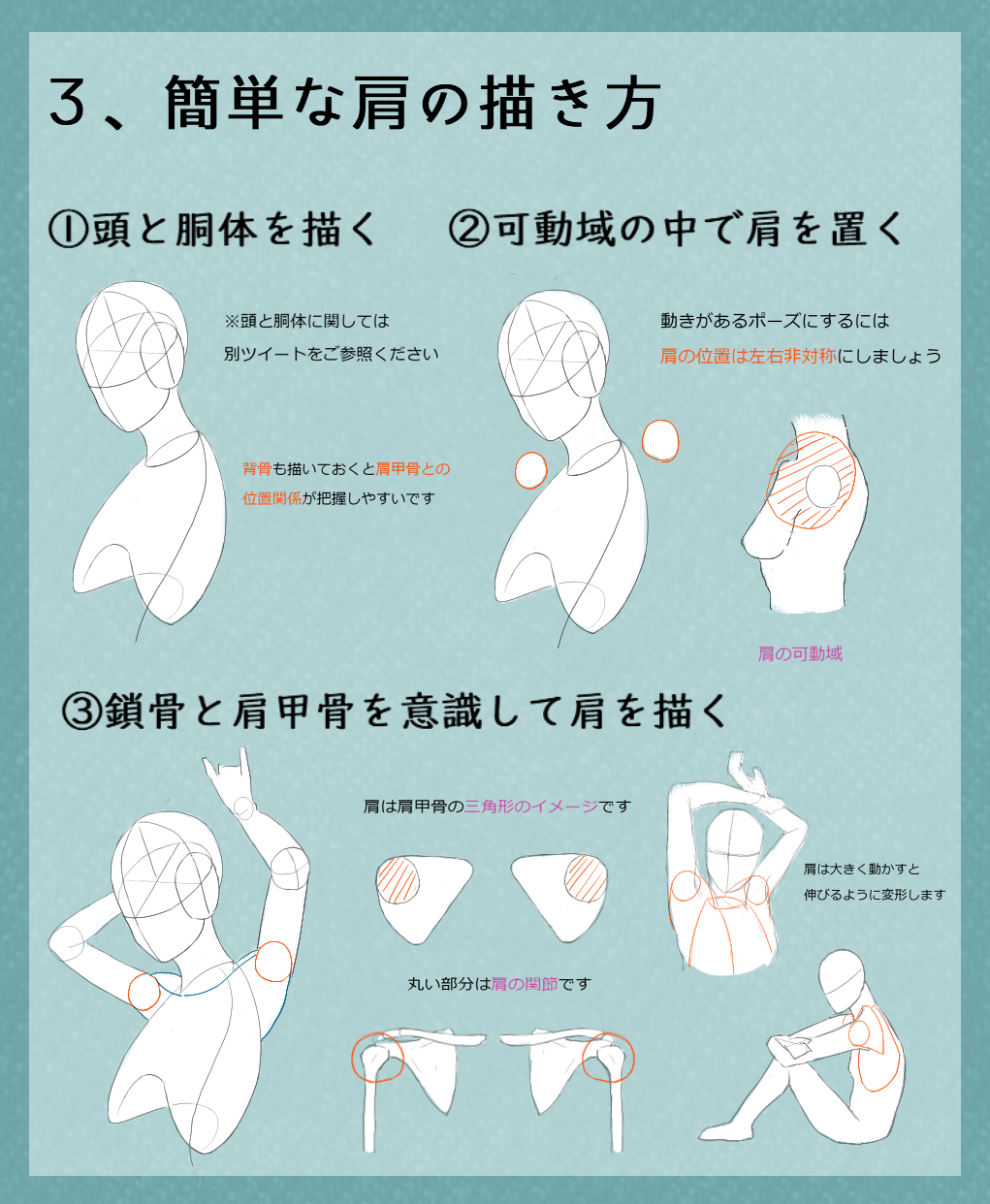 能登ケイ イラスト講座 肩の描き方のコツ 肩は個人的に人体で一番難しいパーツです よくハンガーなどの形で例えられますが それだと直線でしかとらえられません 動きのある肩を描くコツは 肩甲骨 と 鎖骨 を意識し 可動域を把握しておくことです